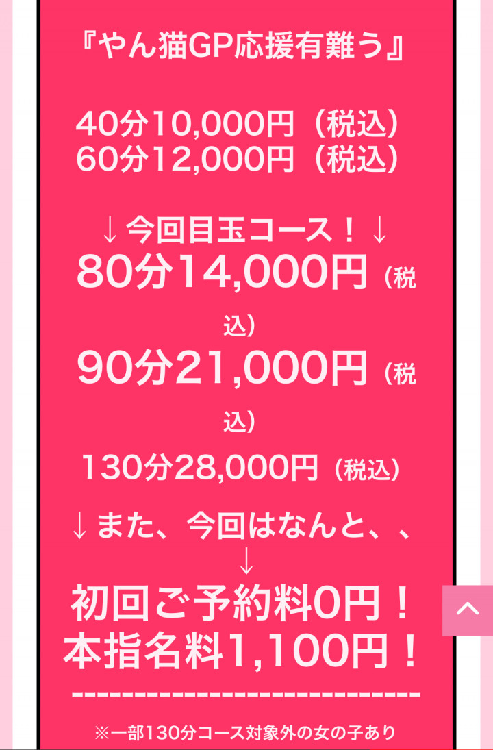 ↓また、今回はなんと、、↓初回ご予約料0円!本指名料1,100円!----------------------------※一部130分コース対象外の女の子あり